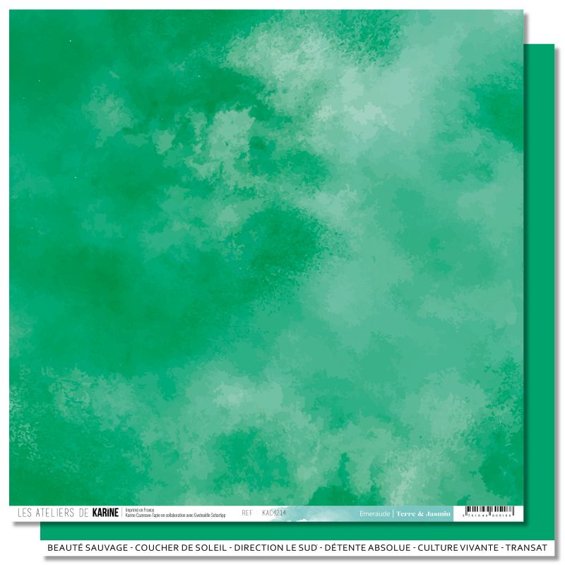 Papier double face Back to Basics Emeraude de la marque Les Ateliers de Karine de 30,5 cm x 30,5 cm ayant pour thème Terre & Jasmin.
