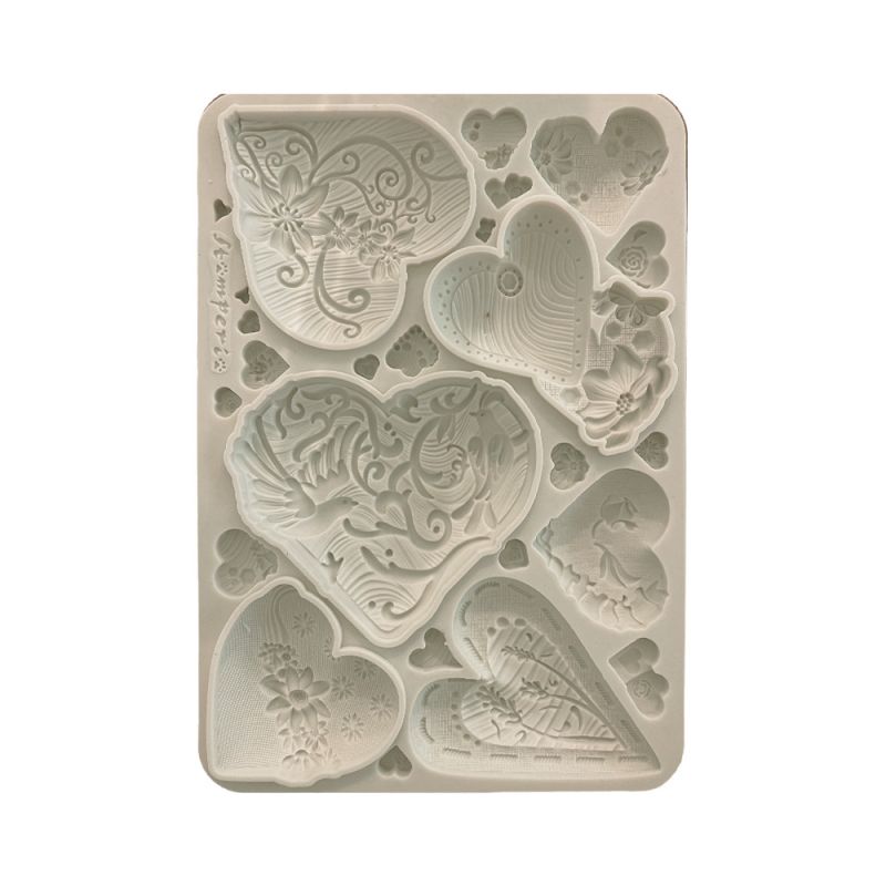 Moule en silicone format A5 de la marque Stamperia collection Alice in Christmas Simple Hearts idéal pour créer des embellissements 3D pour vos pages de scrapbooking, vos projets carterie ou home déco.