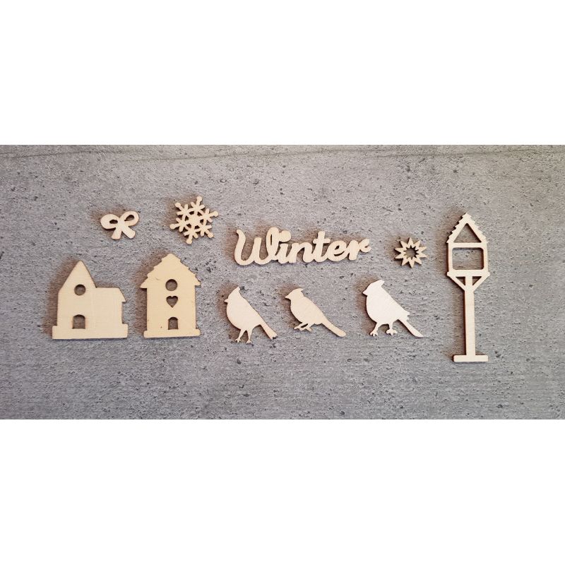 Ensemble d'embellissements en bois sur le thème Oiseau et Volière d'Hiver de la marque CraftEmotions pour décorer vos créations.